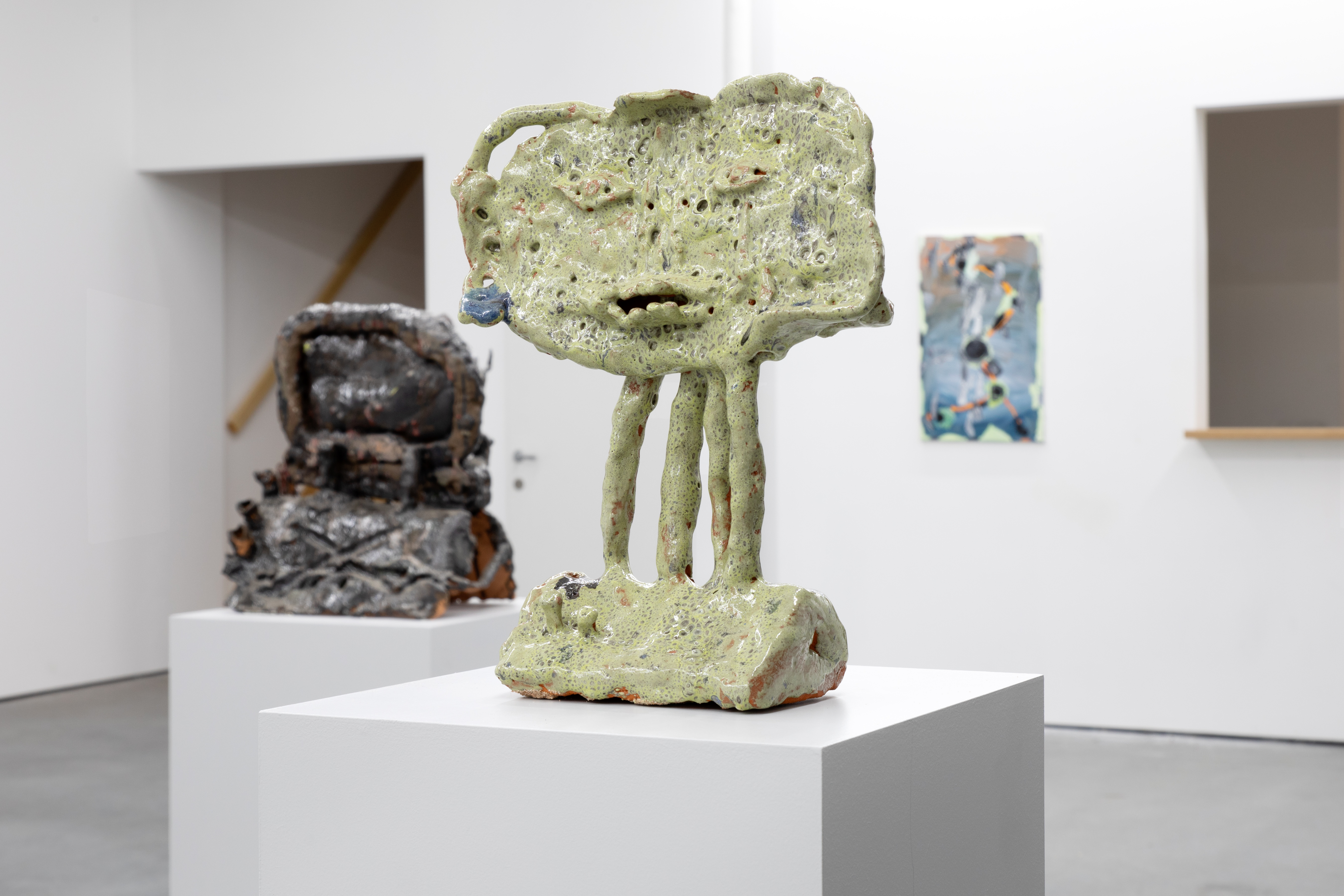 Through processes of distillation and abstraction, they simultaneously draw us in (with glossy colour, cartoonish gestures and anthropomorphic hints) while pushing us away (through awkward articulations, swollen surfaces and bodily traces.)